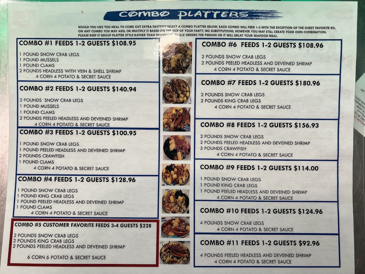1 POUND SNOW CRAB LEGS 1 POUND KING CRAB LEGS 1 POUND PEELED HEADLESS AND DEVEINED SHRIMP 4 CORN 4 POTATO & SECRET SAUCE *IMAGE USED IS COMBO #5 DUE TO SAME ITEMS AND FOR COMBO # 9 IT IS HALF ALL ITEMS FOR THE COMBO #9!!!*