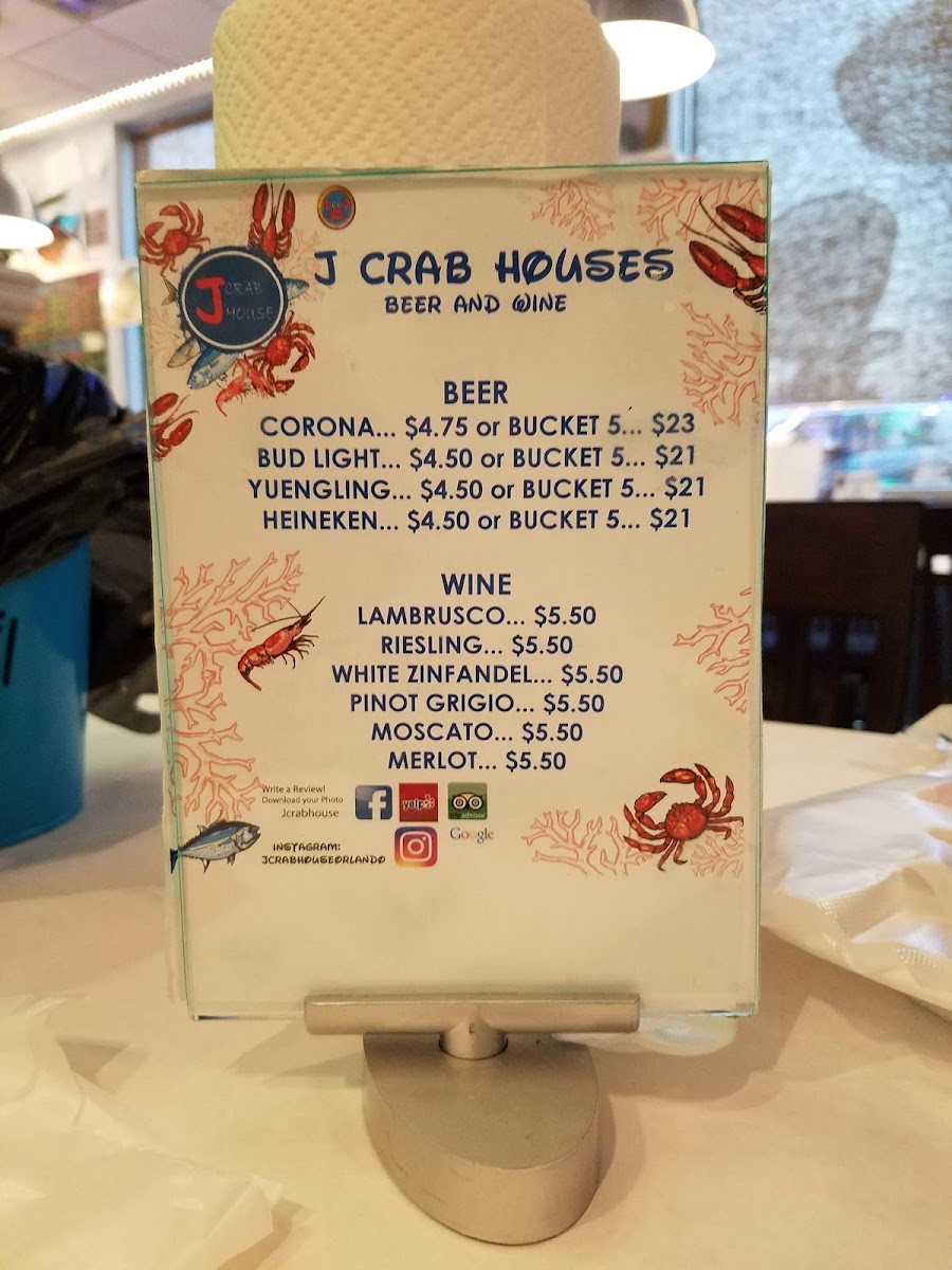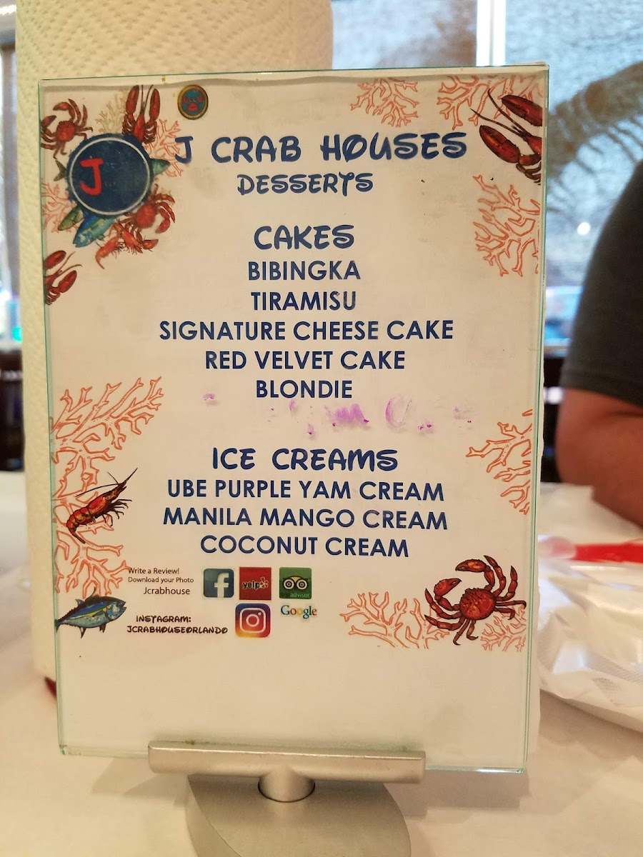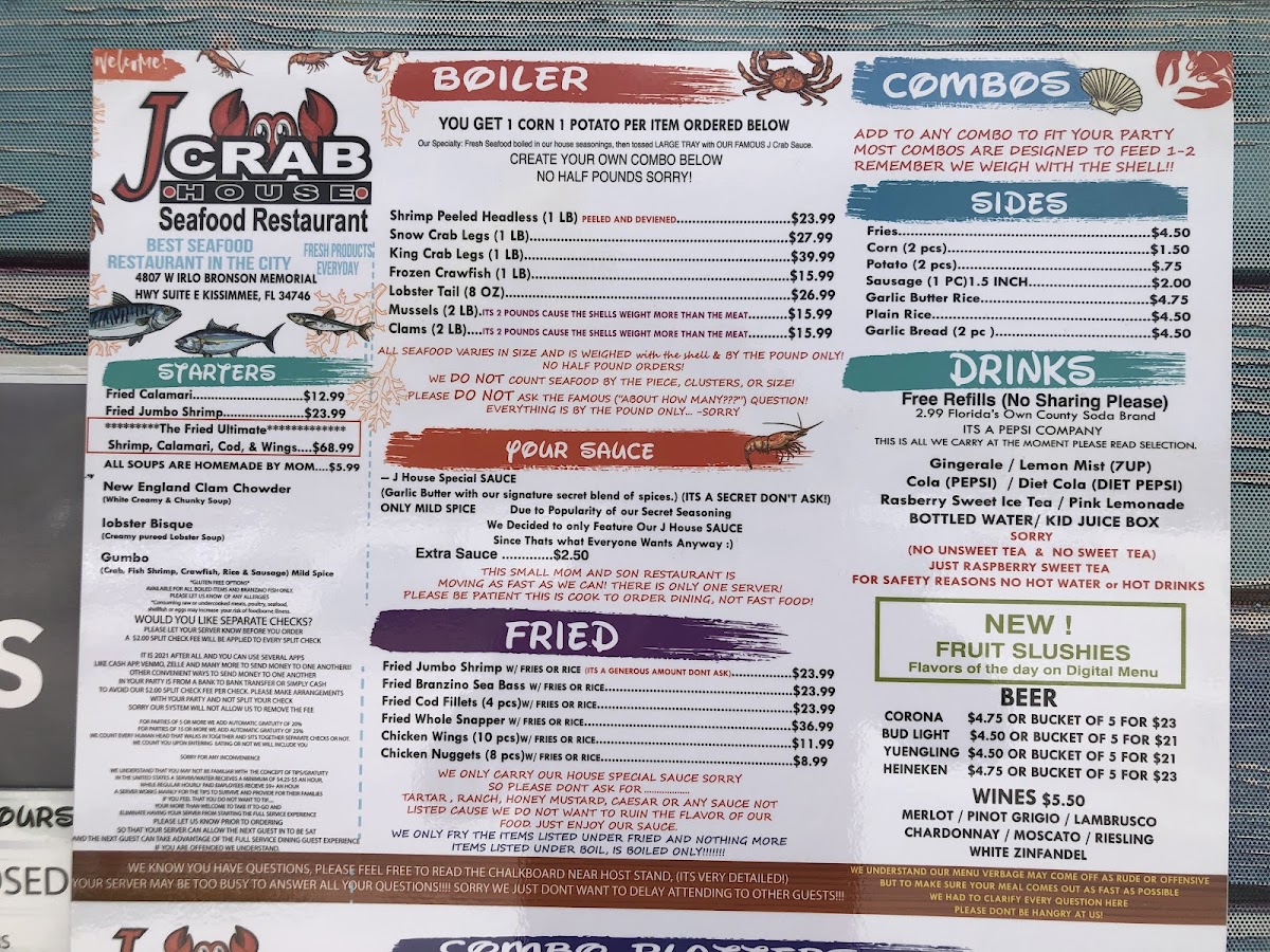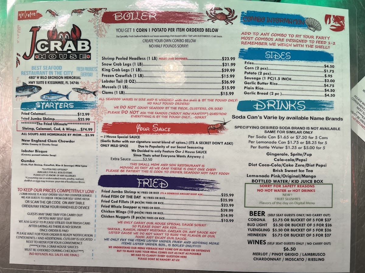 J Crab House offers a diverse and flavorful menu with a variety of combo meals, fried dishes, starters, and unique Filipino options. The J Crab Combo's are designed to satisfy different group sizes, with options like Combo #1 and Combo #2, each feeding 1-2 people, and the popular Combo #5, which serves 3-4 people. For those who prefer fried food, choices such as Fried Jumbo Shrimp, Fried Fish of the Day, and Fried Whole Snapper are available, along with Fried Calamari and Fried Shrimp starters. The restaurant also features a "Create Your Own Combo" section, where customers can choose from a variety of fresh seafood, including 1 LB Peeled Shrimp, 1 LB Snow Crab, and 1 LB King Crab. Sides like J Fries, Corn, and Sausage complement the meal, and beverages range from sodas like Sprite and Pepsi to a selection of beers such as Corona and Heineken. The wine menu offers options like Merlot and Pinot Grigio. For dessert, customers can indulge in Caramel Cheesecake or Coconut Cream Cake. Additionally, J Crab House offers Filipino-inspired dishes such as Adobo with Rice and Lechon, giving guests a taste of traditional flavors. The extensive menu ensures that there's something for everyone, making it a popular destination for seafood and Filipino cuisine lovers alike.