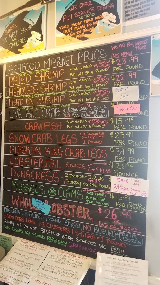 1 POUND SNOW CRAB LEGS 1 POUND MUSSELS 1 POUND CLAMS 2 POUNDS HEADLESS WITH VEIN & SHELL SHRIMP 4 CORN 4 POTATO & SECRET SAUCE